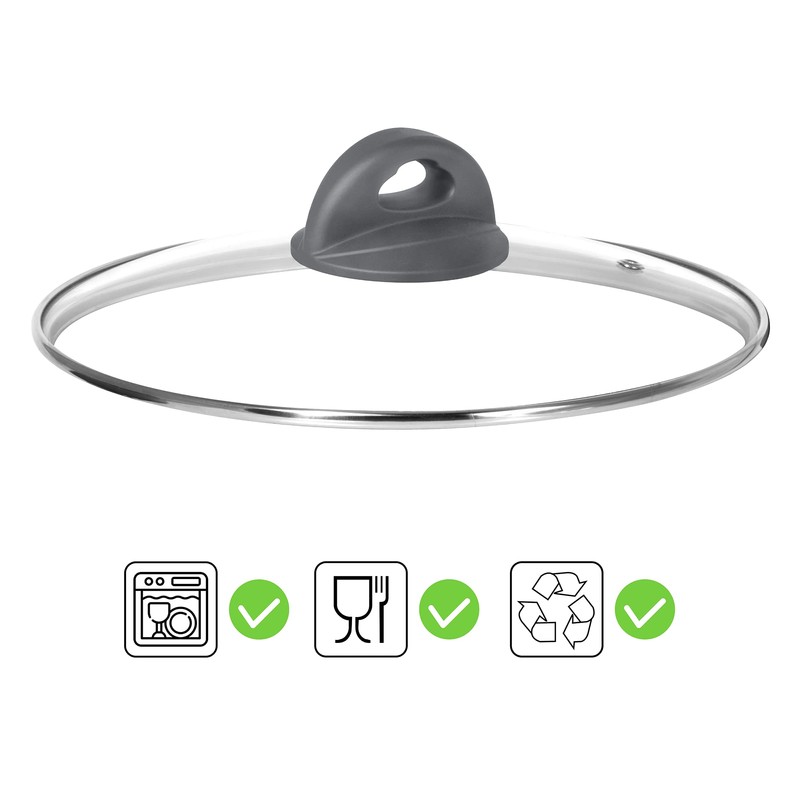 - Tempered glass body with ventilation valve, made to withstand high temperatures and keeps food cooking under control and in total transparency