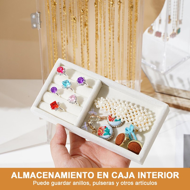colgar hasta 72 collares. La bandeja de terciopelo en la parte inferior puede almacenar 12 anillos y otros artículos
