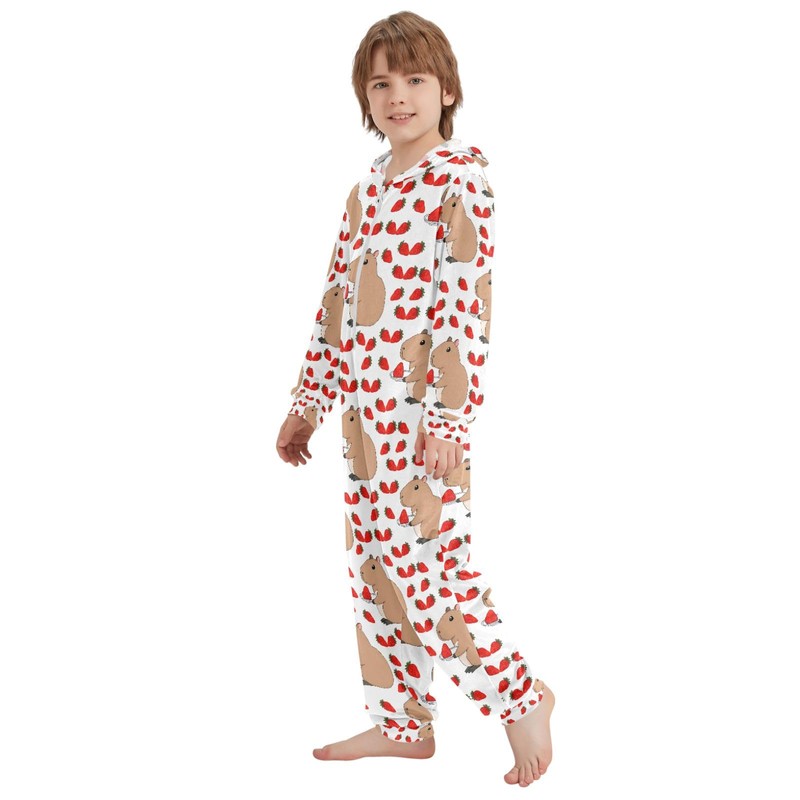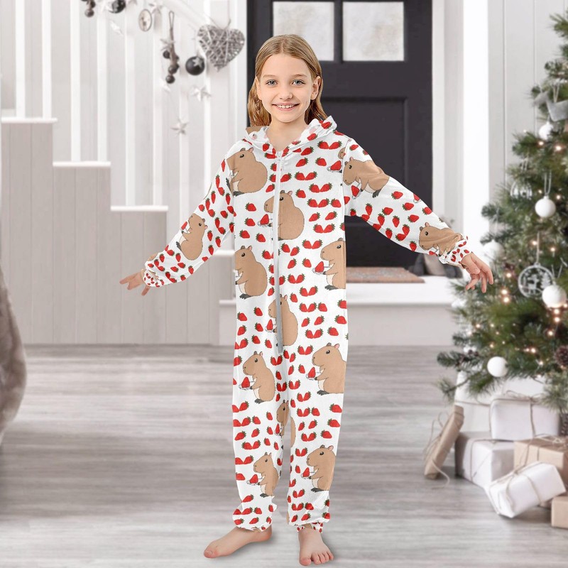 AEZODI Cute Capybara Strawberry Onesie Pajamas Zip Up One Piece Sleepwear Hooded Jumpsuits