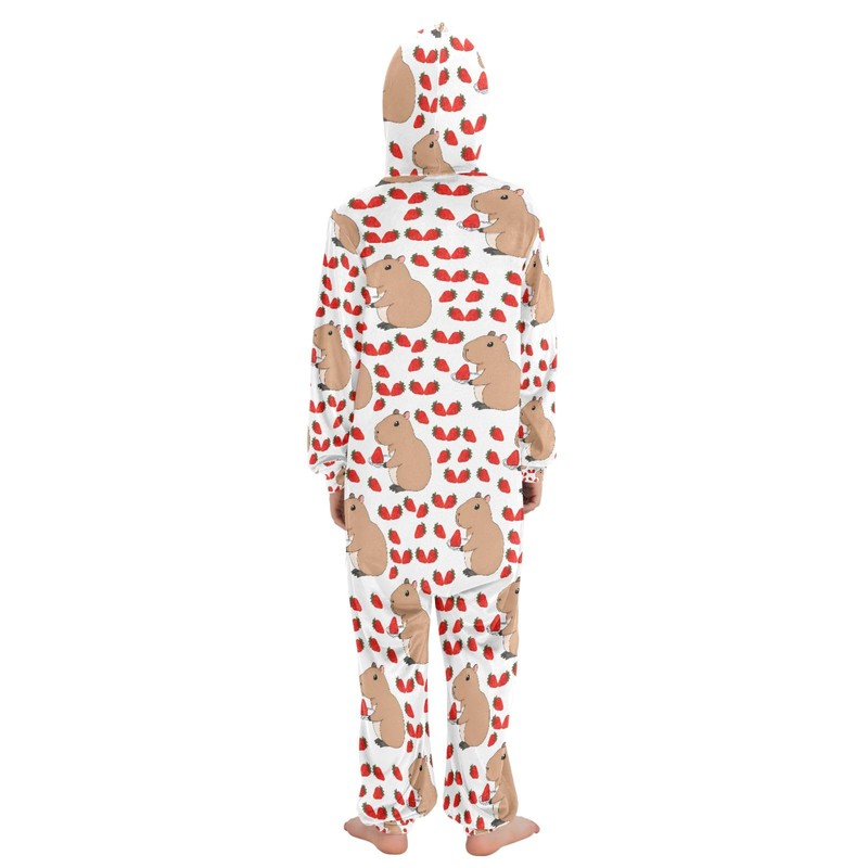 AEZODI Cute Capybara Strawberry Onesie Pajamas Zip Up One Piece Sleepwear Hoo...