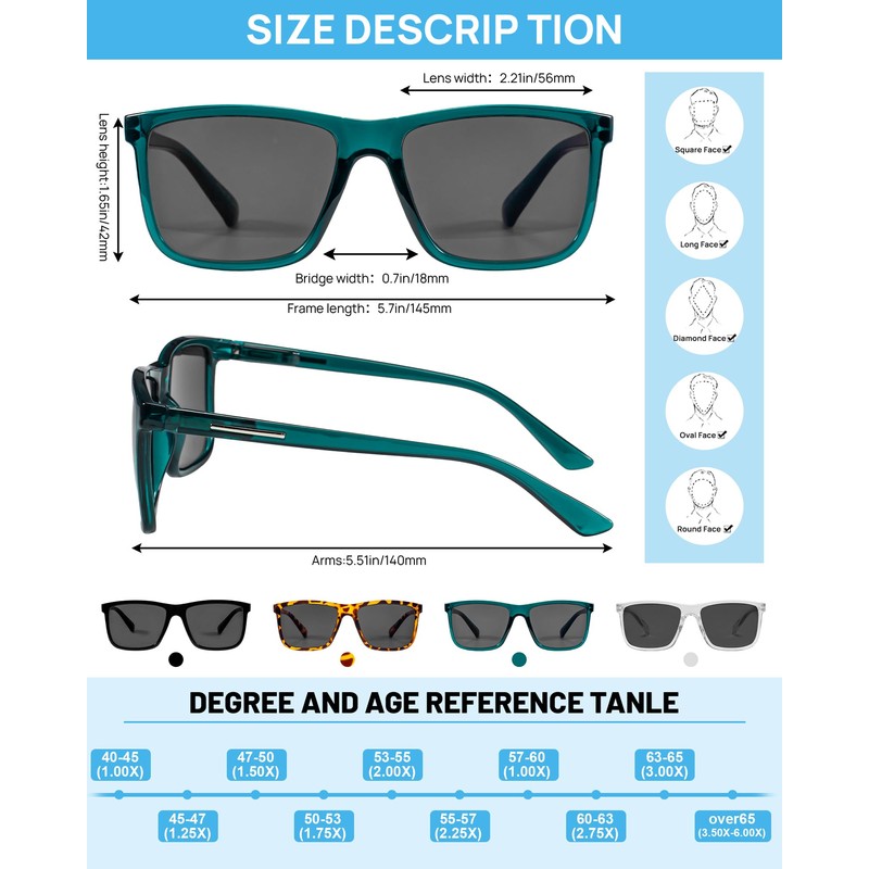 - đ Comfortable to wear all day : Menâs reading sunglasses have flexible spring hinge , can extend 20 degree,perfect fit for all face type. One-piece nose pad will not suppress for long term wearing and convenient for daily using. Lens widthïŒ2.21in/56mm; Bridge widthïŒ0.7in/18mm; temple length:5.51in/140mm ;Lens height:1.65in/42mm