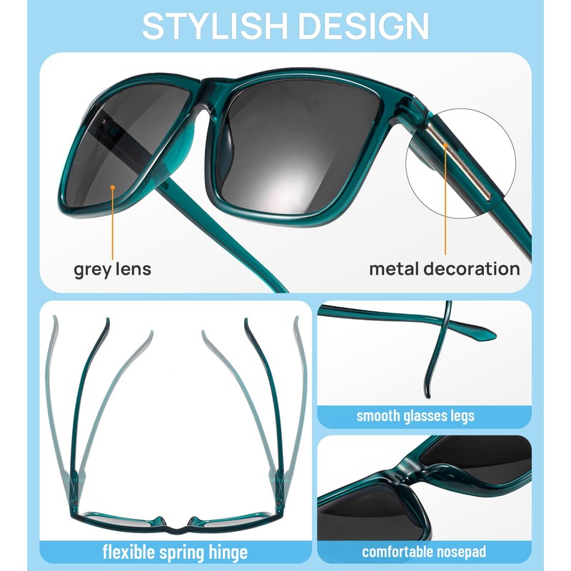 - đ 100% UV400 protection : The square sunglasses readers for men 2.00 block 100% UV400 and UVA / UVB effectively. Protect eyes from glare and block ultraviolet ray in hiking, cycling, fishing, travel or other outdoor activities. Make you eyes more comfortable in daily life. Also, green sun readers use high definition lens give you a natural and clear vision.