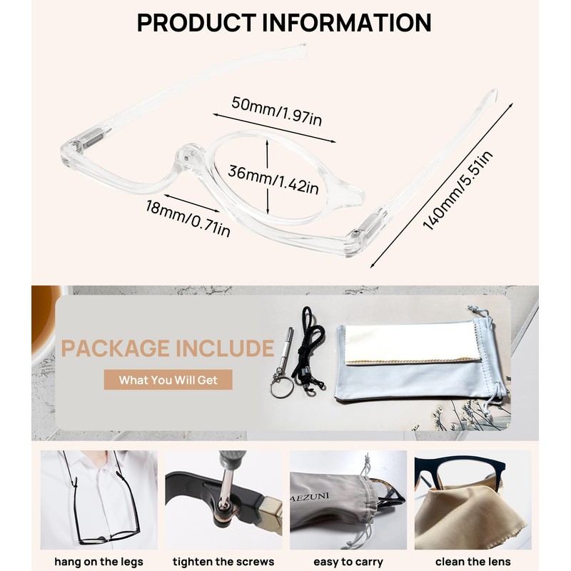 - Designed for makeup:AEZUNI makeup reading glasses for women flip 3.5 are designed to help people makeup better. When you try to makeup your right eye, you can switch the lens to your right, and for right eye, please switch left. Lens width:50mm/1.97in; Bridge:18mm/0.71in; Temple length :140mm/5.51in