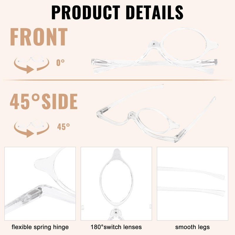 - Multifunctional make up reading glasses : This women’s makeup glasses featuring a single lens that can rotate to facilitate left and right eye makeup application .Use it for wearing eyeliner,mascara and eyeshadow,allow you to see more details about your face. Make your life more convenient. Also,high definition lenses allowing them to be used not just for makeup application, but for crafting,sewing and some activities need close-up work.