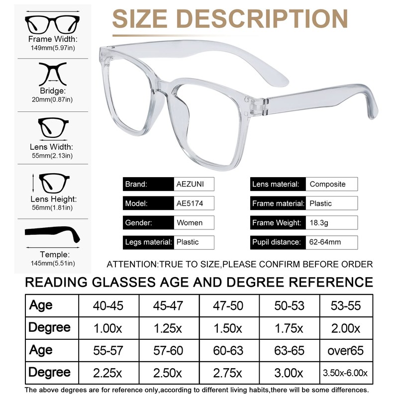 • [comfortable fit]: AEZUNI reading glasses use ergonomic design, one-piece nose pads,suitable for all kinds of nose type.You can hardly feel the presence of the reader glasses,no pressure, no red remarks, bring a comfortable wearing experience.Use sturdy screws instead of spring hinge,increase the using life.With the large eye shape,has the bigger vision,feel enough clarity.