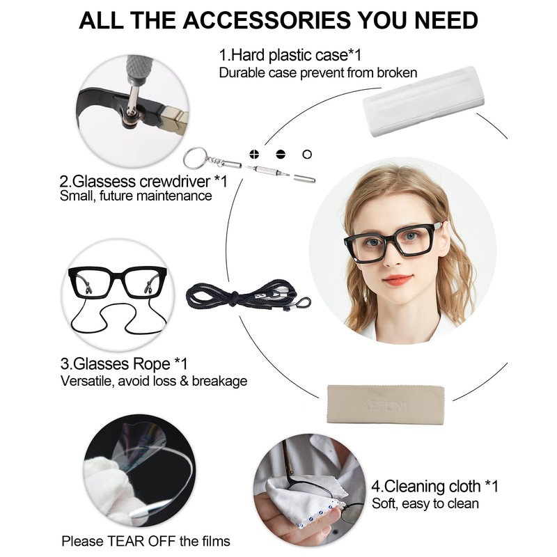 - [Great value]:Stylish reading glasses 4.0x*1,a three-in-one screwdriver*1, anti-lost rope*1,soft cleaning cloth*1,portable pouch*1; Any problem in the readers, please contact the AEZUNI service team without hesitation.