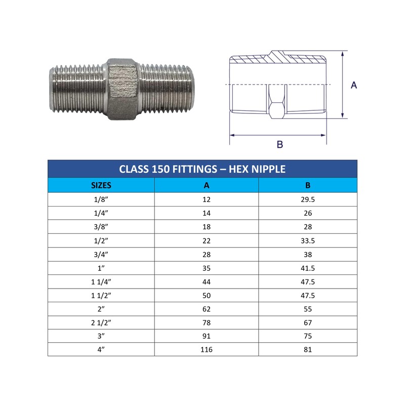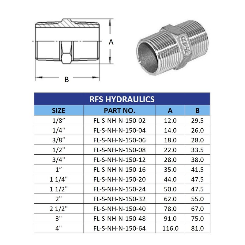 AF Hydro Stainless Steel SS316 Hex Nipple Pipe Fitting, 2 1/2''NPT Male Thread, Pressure Rating up to 150 PSI, Class 150 Connector Adapter