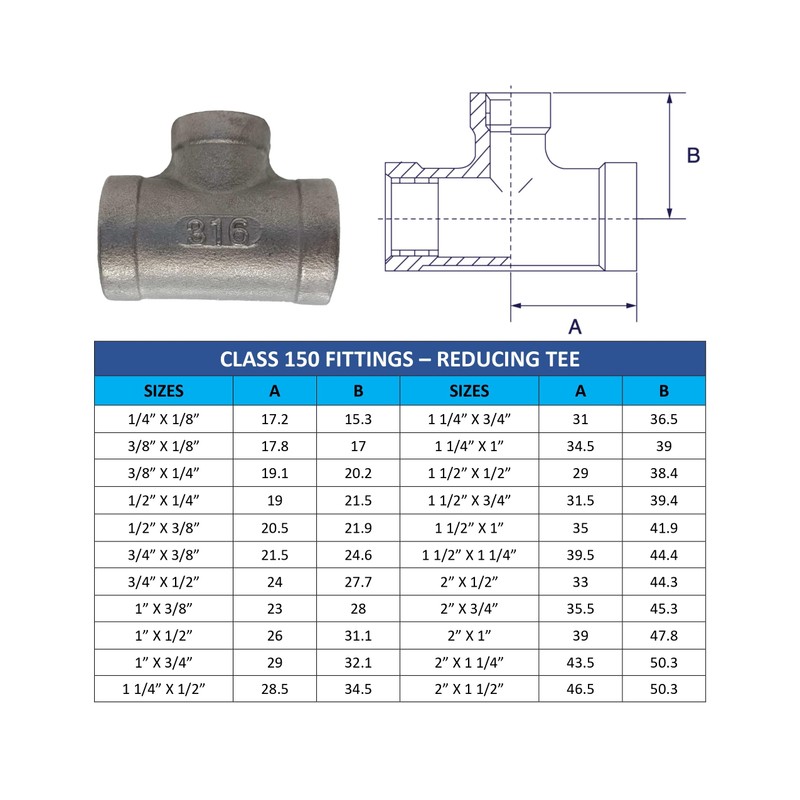 AF Hydro Stainless Steel SS316 Reducing Tee Pipe Fitting, 1 1/4"NPT x 1 1/4"NPT x 1"NPT Female Thread, Pressure Rating up to 150 PSI, Class 150 Reducer Connector Adapter
