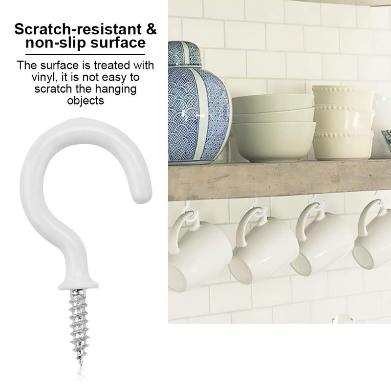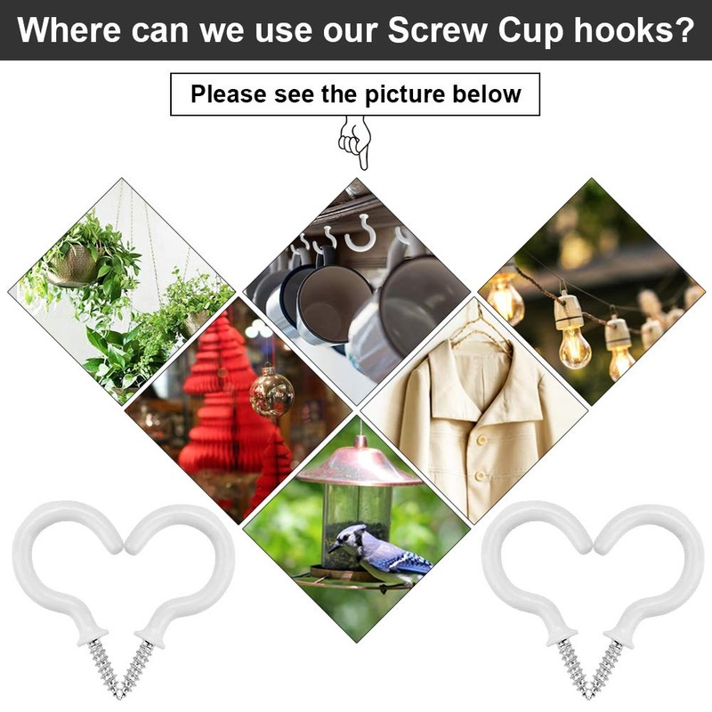 - Wide range of applications: ideal for outdoor Christmas lighting, cup hooks go deep enough to have a firm grip on the Christmas lights they hang. Super strong plastic coated hooks improve carrying and not easy to deform. These screw hooks are suitable for home, kitchen, bar, garden etc., e.g. B. for hanging plant cups to create more space and make the kitchen tidy.