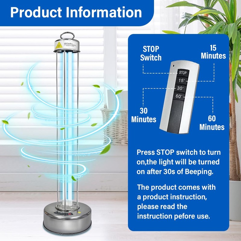 • 【NOTE】 Humans and pets MUST NOT be in the room while the lamp is lit!After the appliance has finished working, ventilate the room for 30 to 60 minutes before entering the room。Trust: We commit you to testing UVC
