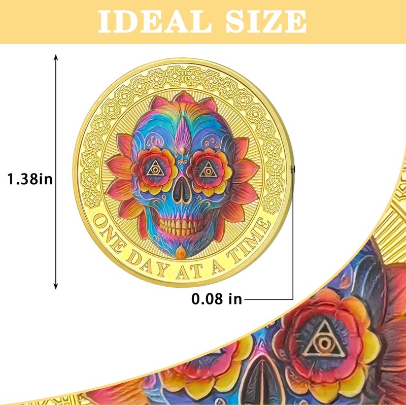 - DEEPER MEANING: This AA coin showcases a vibrant skull adorned with colorful floral accents, symbolizing the transformative journey of addiction recovery. The message “ONE DAY AT A TIME” serves as a powerful reminder of the strength and courage needed to make consistent progress on the path to sobriety