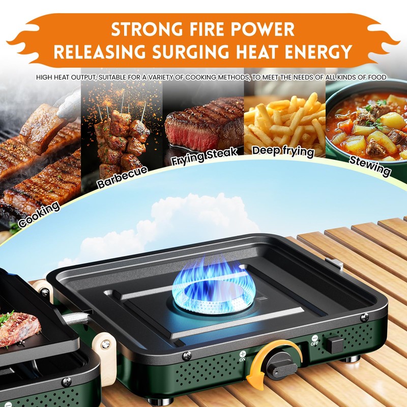 - BUILT - IN GRILL FOR VERSATILITY:2 - burner propane camping stove stands out with its built - in grill. it transforms into a full - fledged outdoor cooking station. as a propane camping stove, it allows you to grill burgers, hot dogs, and more. the grill surface evenly distributes heat for perfect grill marks. it's a must - have addition to your camping gear, providing cooking variety for any camp stove propane lover.