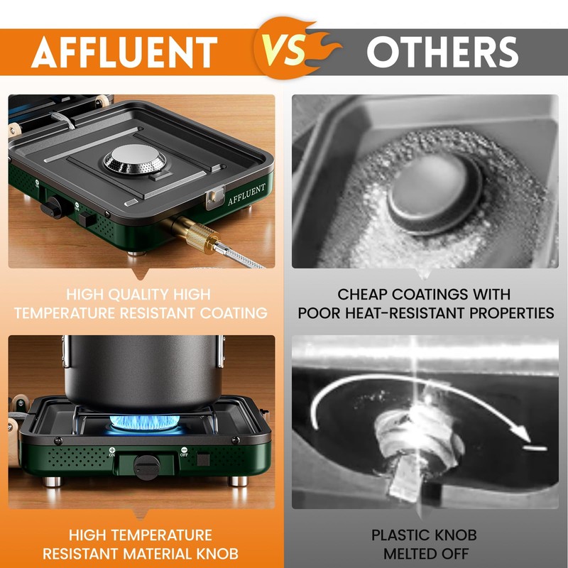 - USER - FRIENDLY FEATURES:Designed with users in mind, the AFFLUENT camp stove has a piezo ignition system, eliminating the need for matches. The easy - carry handle enables smooth movement around the campsite. With two adjustable burners, you can customize your cooking. It's perfect for families, groups, or solo campers wanting a stress - free outdoor cooking experience. It's an outstanding camp stove propane option.