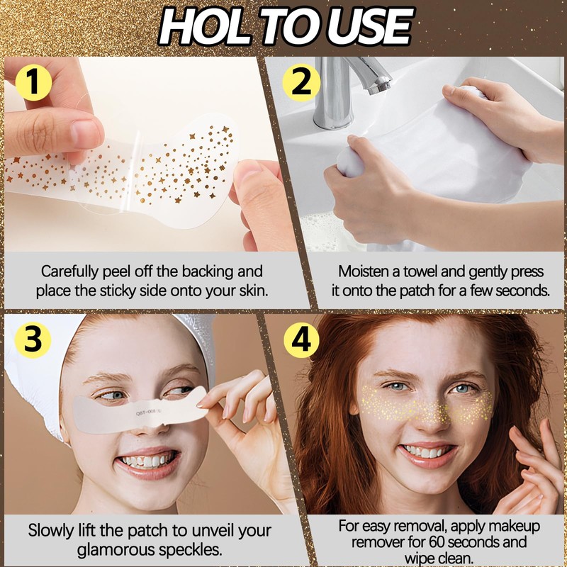 - EASY TO USE: The gold sparkle freckles for women are easy to use, just gently peel, stick and dab to achieve a natural looking spot effect. Tear off the adhesive backing and place the sticky side on your skin; gently press the entire patch with a damp sponge or towel; after 30 seconds, gently peel off the patch to reveal attractive spots
