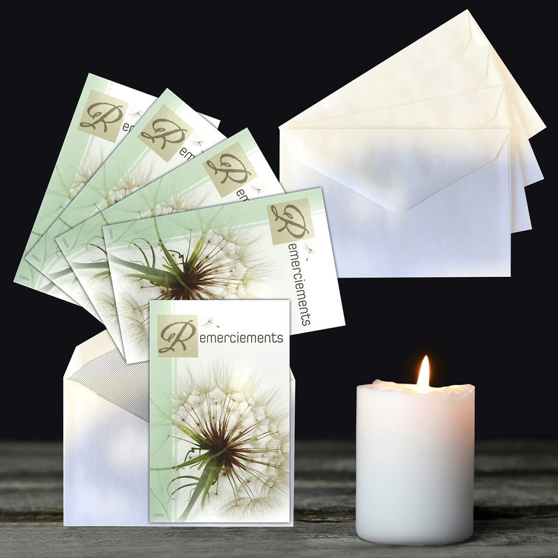 Afie C5202 Thank You Sympathy Pack of 5 Identical Cards + 5 White Envelopes Size 9 x 14 cm Funeral Death Mourning Dried Flower Dandelion Seeds Sowing Pouch Made in France