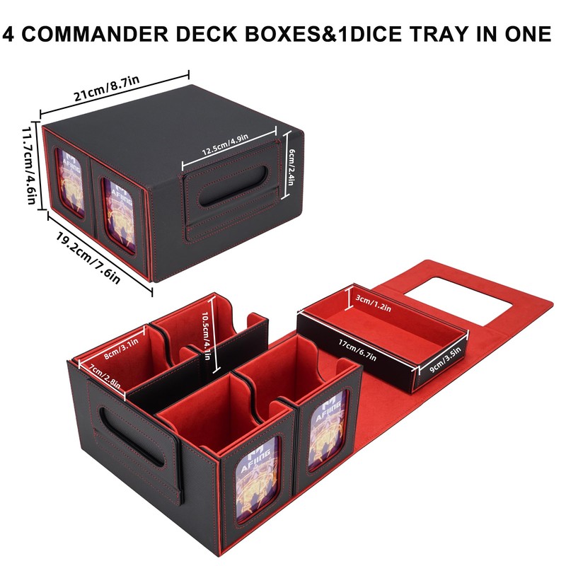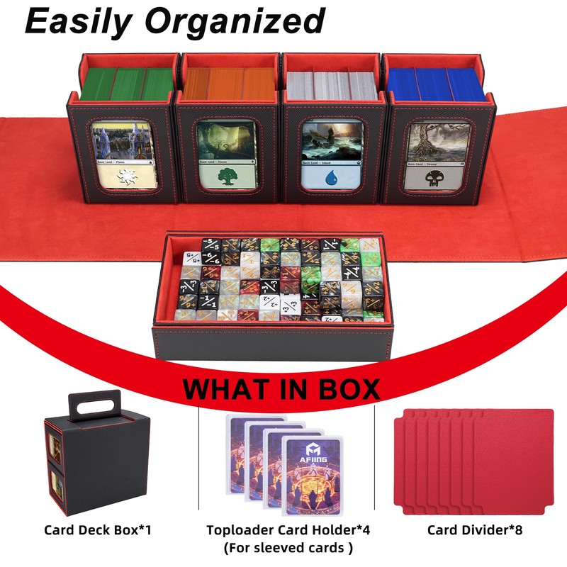- 5-in-1 Design with Display Window:AFIING's globally patented 5-in-1 Commander deck box features 4 individual deck cases with transparent windows to proudly showcase your favorite cards using the 4 included Toploader holders. A detachable dice box with lid keeps your game accessories, like dice and counters, secure and organized.