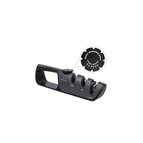 - Ángulo de filo: con un ajuste manual que le permitirá afilar su cuchillo de la mejor manera, ya que no todos los cuchillos requieren el mismo ángulo de filo por sus características de corte.