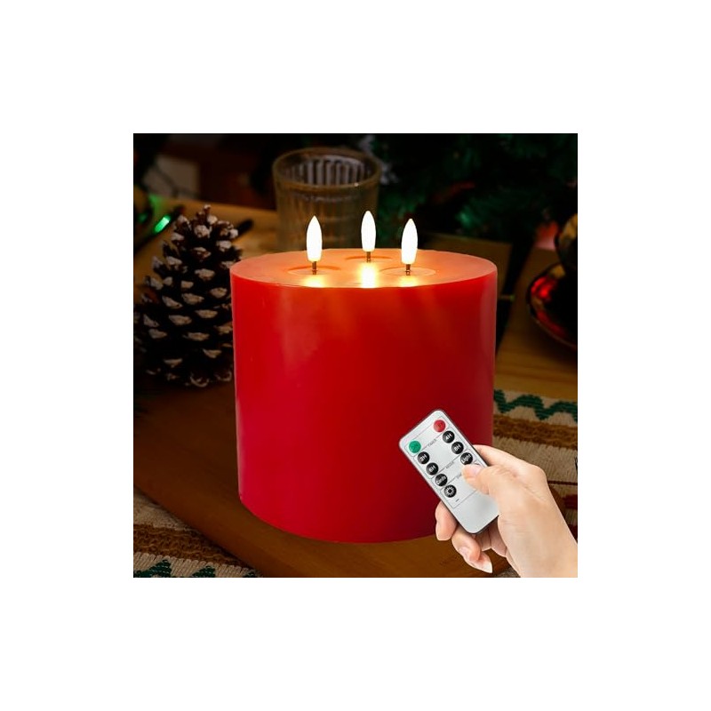 AFINETH Extra Large Flameless Candles, 6"x6" Real Wax Battery Operated Candles with Remote and Timer, Flickering LED Pillar Candles with 3 Wicks for Home, Christams, Party, Holiday, Red