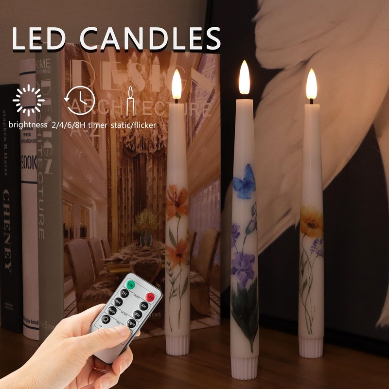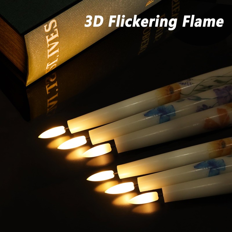 • 🔥FLOWER DESIGN: Upgraded pretty spring flower design with classic taper candles, these flameless candles create a dynamic atmosphere! Real wax made, with incredibly realistic 3D flame, these flickering candles look and feel like real candles, perfectly simulate the real flame for a romantic and cozy atmosphere.