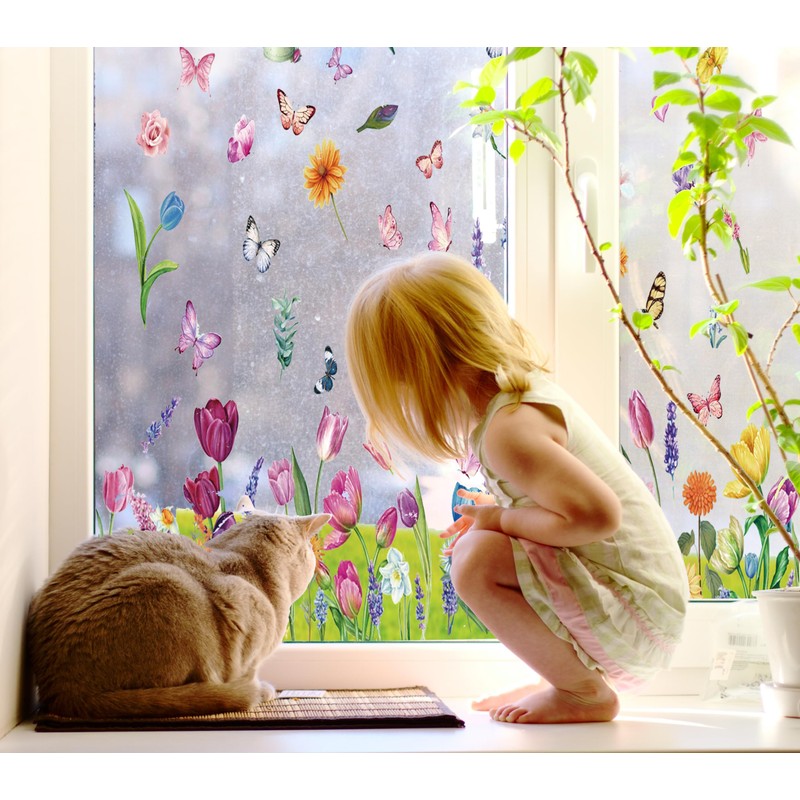 - Plenty spring window clings for glass windows: 132PCS in total, 9 different styles, each one has a sufficient number of flowers and butterflies. window cling size 11.8x7.8 inch, all in a clear bag.