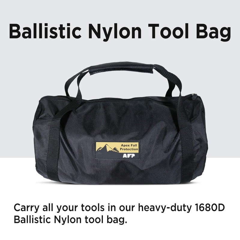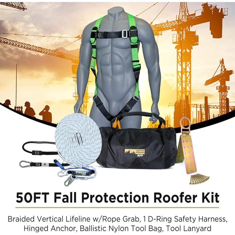 AFP 50FT Fall Protection Roofer Kit Braided Vertical Lifeline w/Rope Grab, 1 D-Ring Safety Harness, Hinged Anchor, Ballistic Nylon Tool Bag, Free Tool Lanyard | OSHA & ANSI Rated