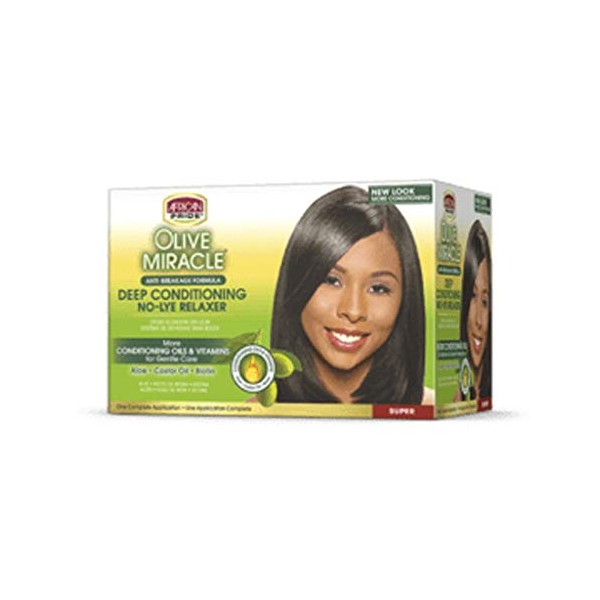 African Pride Olive Miracle Deep Conditioning No-Lye Relaxer Super - Contains Aloe Vera, Castor Oil & Biotin to Condition, Moisturize & Protect Hair, 1 Kit