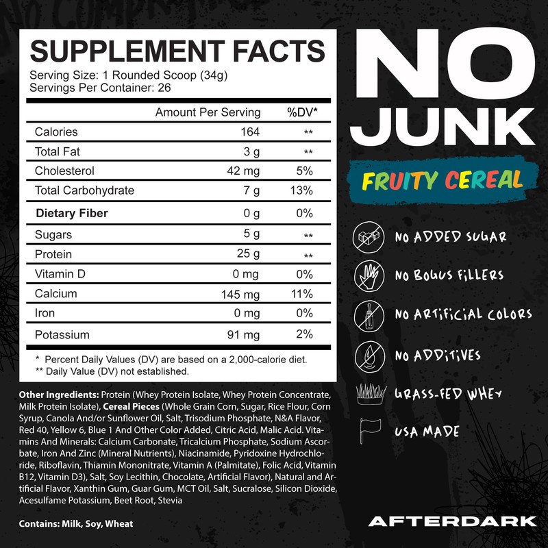 AFTERDARK AfterBites Whey Protein Powder, 25g Protein, 4.5g BCAA’s, Easy Dissolving, No Artificial Colors or Fillers, Isolate Protein, USA Made, 26 Servings, Fruity Cereal