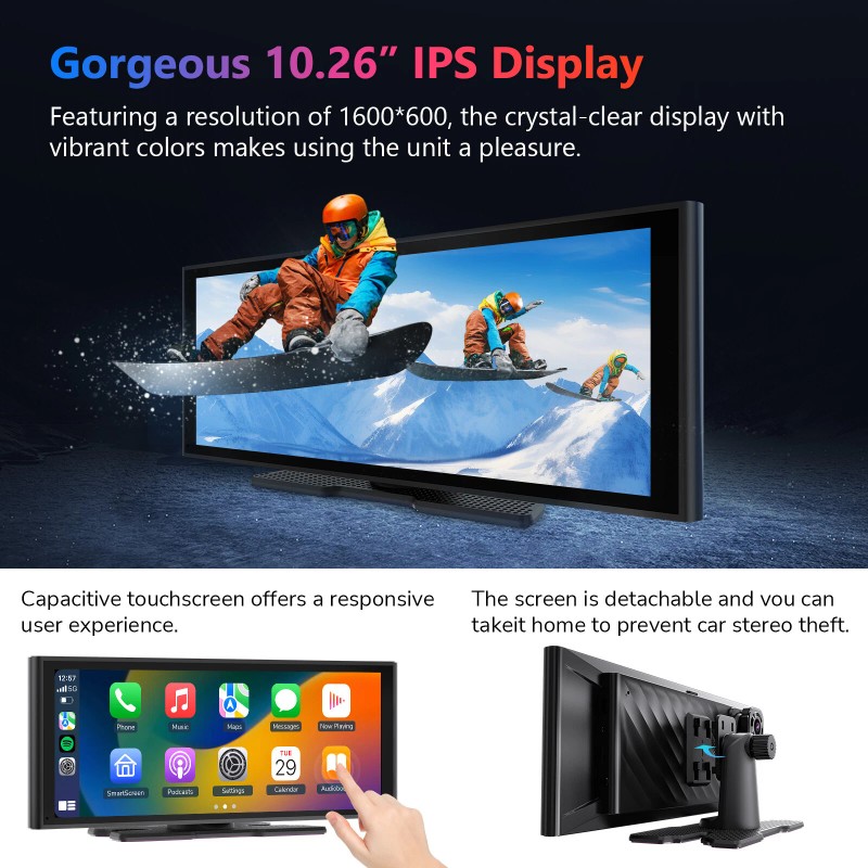 - 【Unmatched 10.26" Display with Airplay and Miracast】Eonon P4 car stereo's wireless CarPlay screen and Android Auto screen offer unmatched display capabilities with Airplay and Miracast screen mirroring. Enjoy your phone's content on a stunning 10.26-inch display. This portable apple carplay screen features a resolution of 1600*600 and supports 1080P videos. On the long road, you can watch your favorite TV shows and movies with this car player, it supports most audio, image, and video formats.