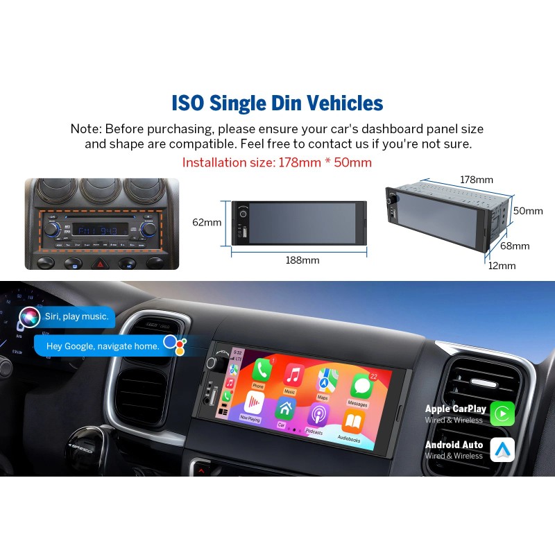 2. An ISO Wiring Adaptor and single din kit (both not included) may be needed for easy installation. Please confirm the installation size.