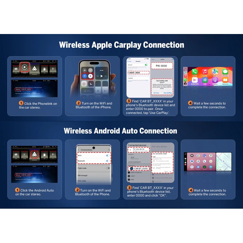 • ✅ Wireless Apple CarPlay & Android Auto – Hands-free navigation, calls, music & voice control