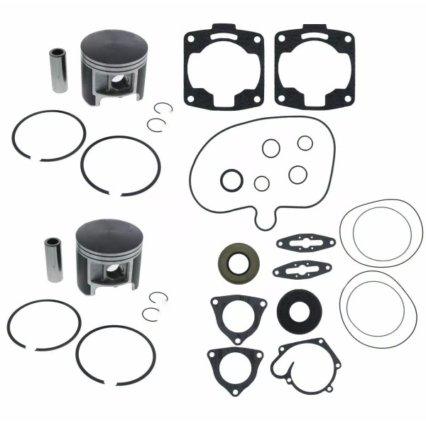 - Includes (2) pistons, rings, wrist pins, circlips, caged wrist pin needle bearings, and a complete gasket kit that includes crank seals.
