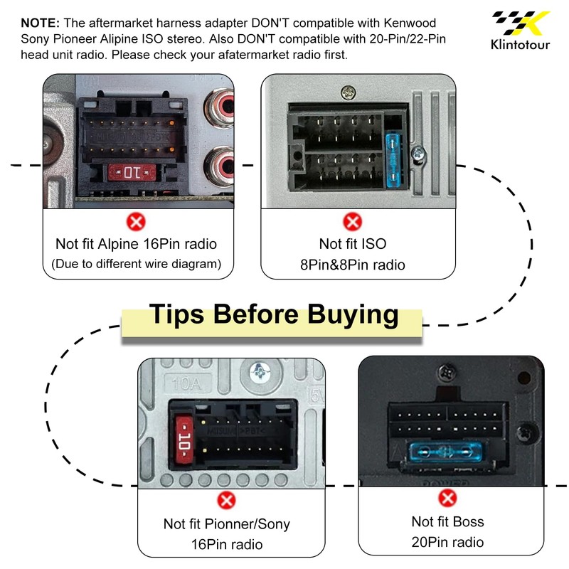 - Tips Before Buying: The aftermarket radio adapter is NOT compatible with Kenwood Sony Pioneer Alpine stereos, even if the plug looks the same. It is also NOT compatible with ISO double pin stereos or 20-Pin/22-Pin head unit radio. Please check your aftermarket radio first. The aftermarket harness adapter does NOT support JBL function.NOT compatible with premium AMP systems,like bose, infinity etc;