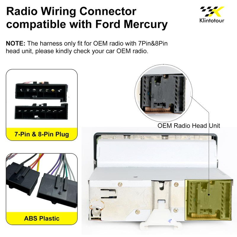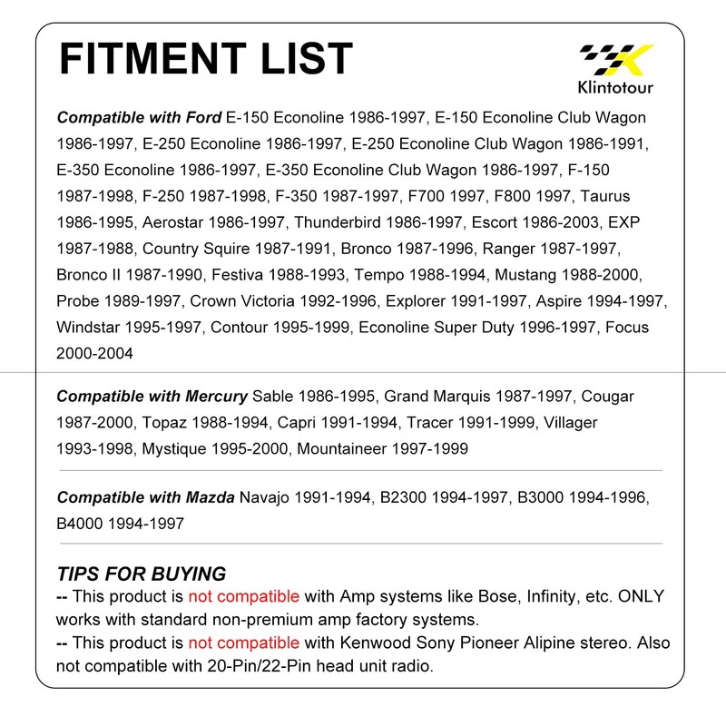 - Explorer (1991–1997), F-150 (1987–1998), F-250 (1987–1998), F-350 (1987–1997), F700 (1997), F800 (1997), Festiva (1988–1993), Focus (2000–2004), Mustang (1988–2000), Probe (1989–1997), Ranger (1987–1997), Taurus (1986–1995), Tempo (1988–1994), Thunderbird (1986–1997), Windstar (1995–1997). NOTE: If your car OEM radio head unit is not 7-Pin&8-Pin, this harness DOESN’T fit your car;