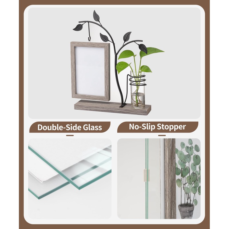 As an elegant craft to decorate and personalise your living and office space. Rustic design frame in oak grain for displaying your keepsake photos. Glass bud vase for growing invigorating hydroponic plants.