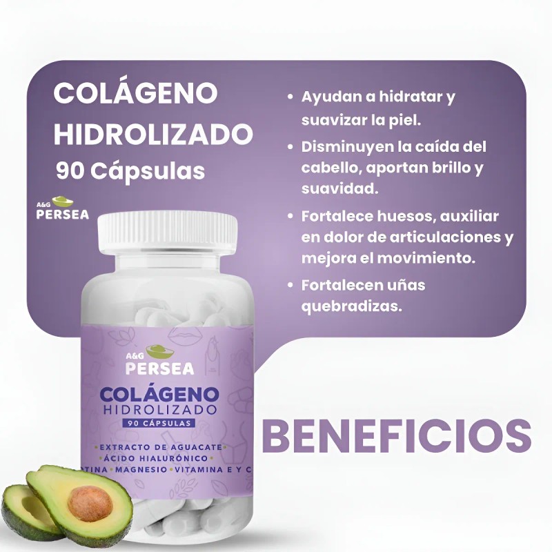 - A&G Persea es una marca líder en suplementos de alta calidad en México. Somos los únicos que incorporamos extracto de aguacate en nuestras fórmulas, un ingrediente funcional que potencia los beneficios del colágeno y promueve un bienestar integral. Nuestra fórmula avanzada combina colágeno hidrolizado, biotina, ácido hialurónico, vitaminas E y C, y extracto de aguacate, ideal para fortalecer articulaciones, piel, cabello y uñas. Beneficios: