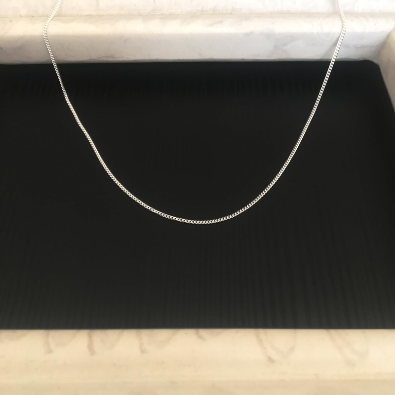 Diseño de eslabón tipo barbada con un largo de 45 cm que proporciona una caída media, lo que la hace ideal para dijes pequeños y medianos, con un grosor de 1.1 mm que hace que refleje un brillo muy sutil y elegante.