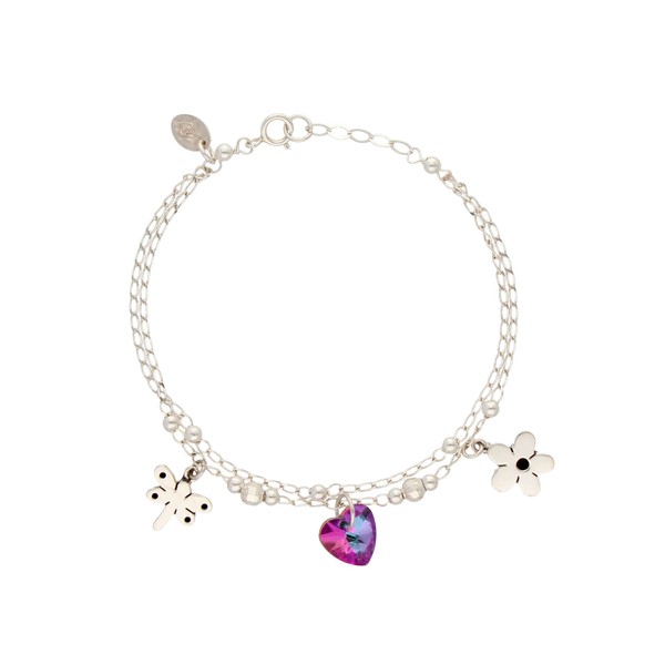 Agálea | Pulsera de plata ley de doble cadena con un dije de libélula y uno de flor de plata y un dije de corazon morado tornasol de cristal austriaco para mujer.