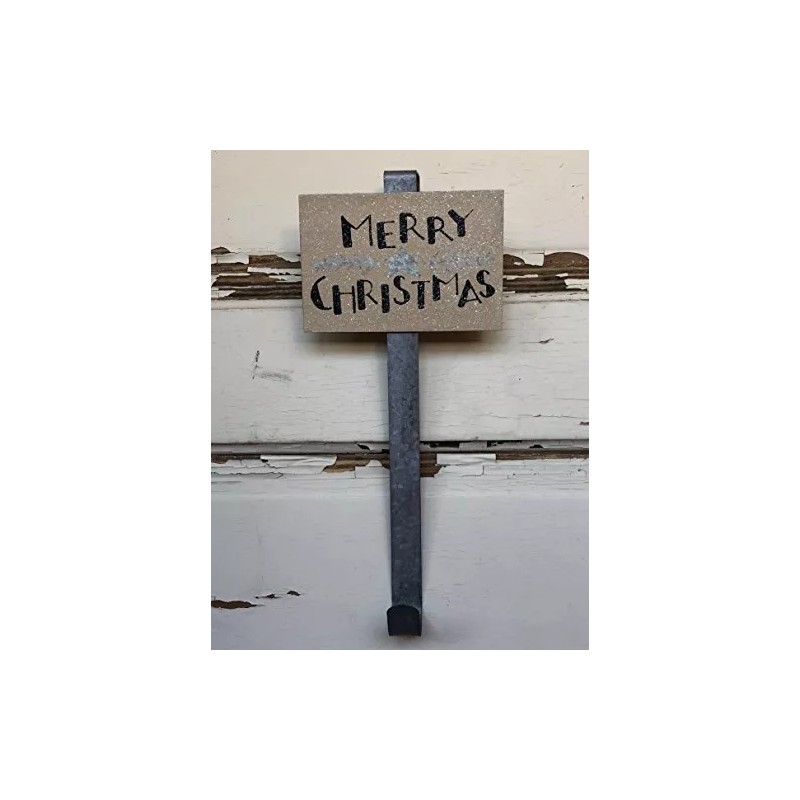 Item: Christmas Decor - Merry Christmas Wreath Door Hanger Details: Embellishment sign adhered to a heavy-duty metal frame. See picture for details. Size: Sign: 6" x 4" approx. Galvanized Hanger: 15" long Mfr: Agape Gifts Designs