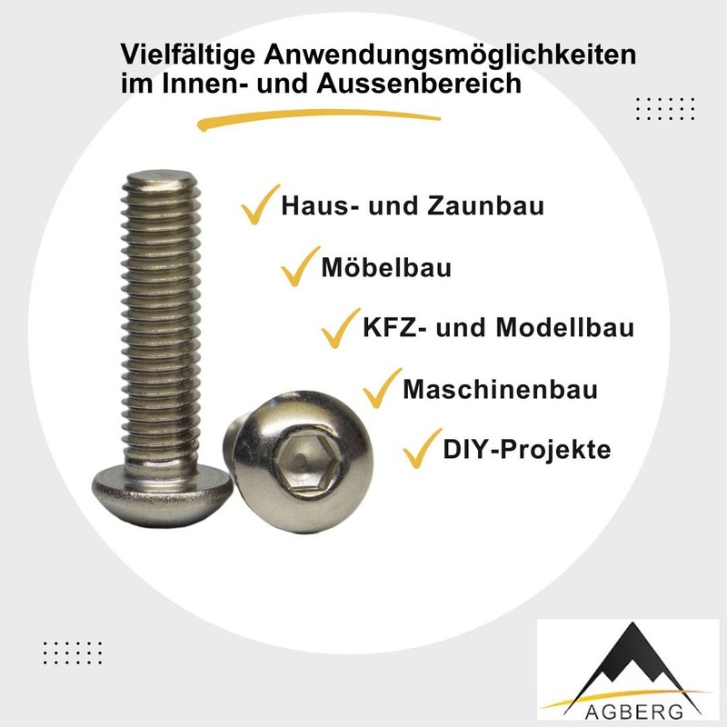 - Easy to install with hexagon socket (ISK): installation is done with Allen keys. The semi-circular round head allows for precise placement and is ideal for applications where a flush and flat connection is desired - perfect for projects that require a clean and aesthetic look.