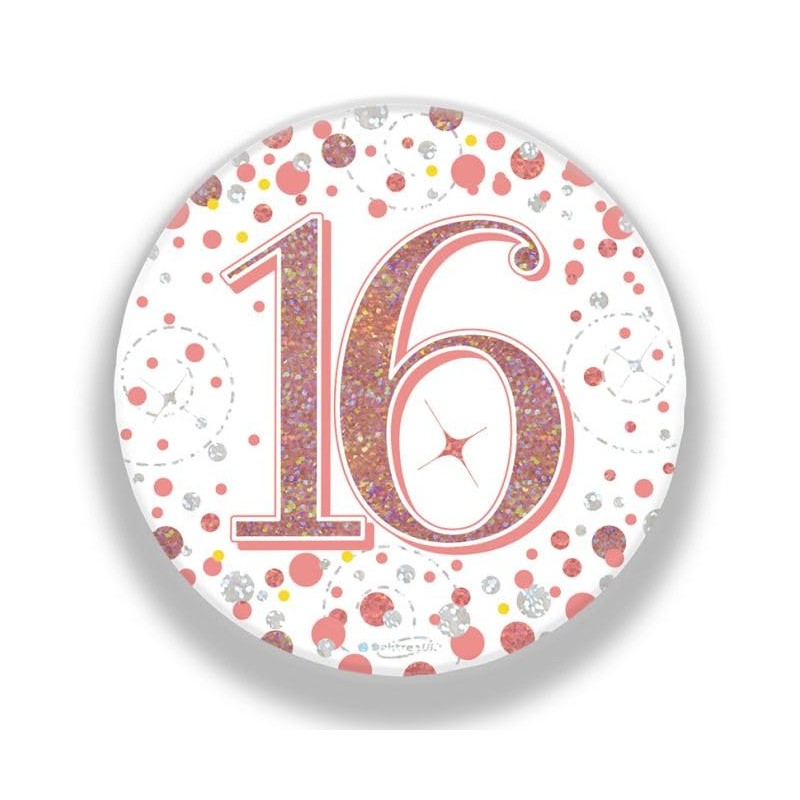 Age 16 Birthday Badge Rose Gold Holographic Recyclable Sweet Sixteen 16th Birthday Party Badge OTRG