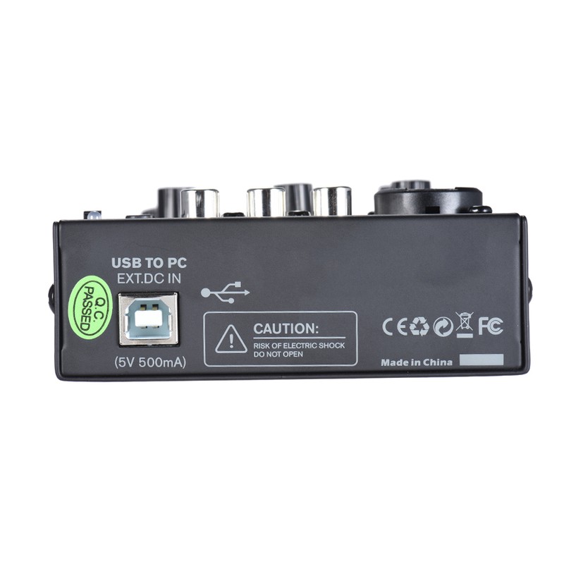 1、Compact size 5-channel mixing console with USB 2.0 audio interface, and audio data can be sent between the mixer and computer. 2、DC 5V low voltage powered, supports 5V power bank or computer power supply via the including USB cable, convenient usage. 3、It features 5 total inputs including a COMBO(XLR+TRS) jack with phantom 18 V power and EQ on Channel 1,which can be used to connect mono signal, such as XLR microphone or 1/4\" line level.