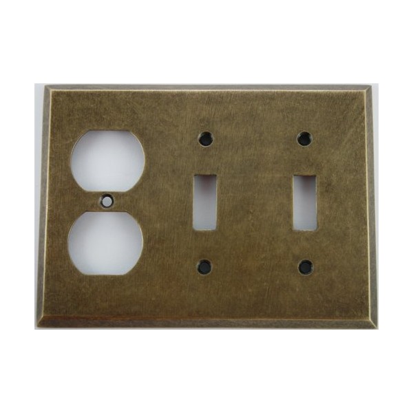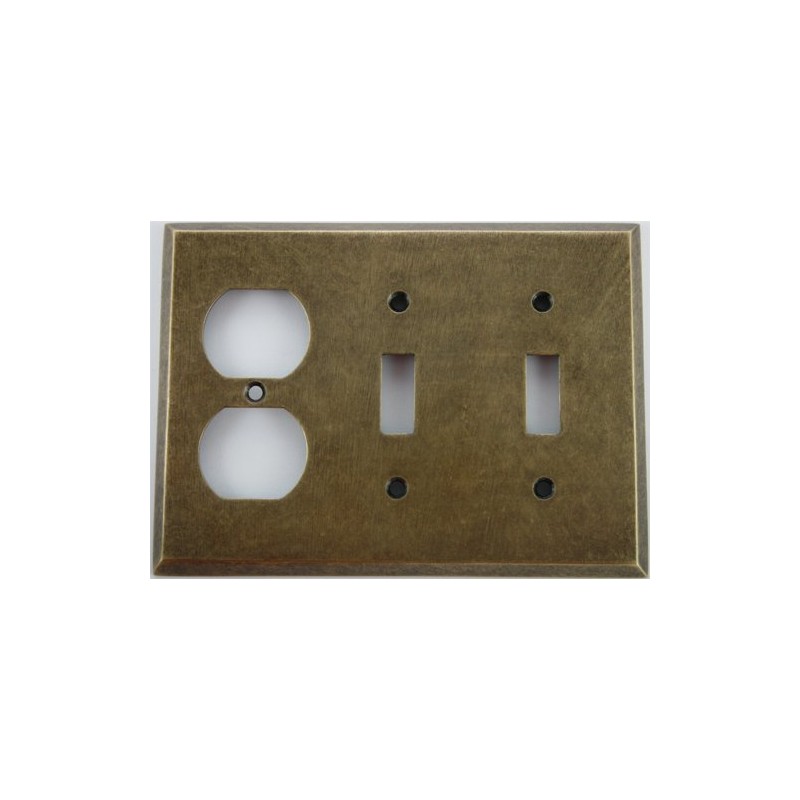 This beautiful wall plate is made of solid forged brass that is hand finished to make it look like the brass plate has aged naturally. The plate will accommodate two toggle switches and one duplex outlet. This plate would be a beautiful accent to any room in your house or office.