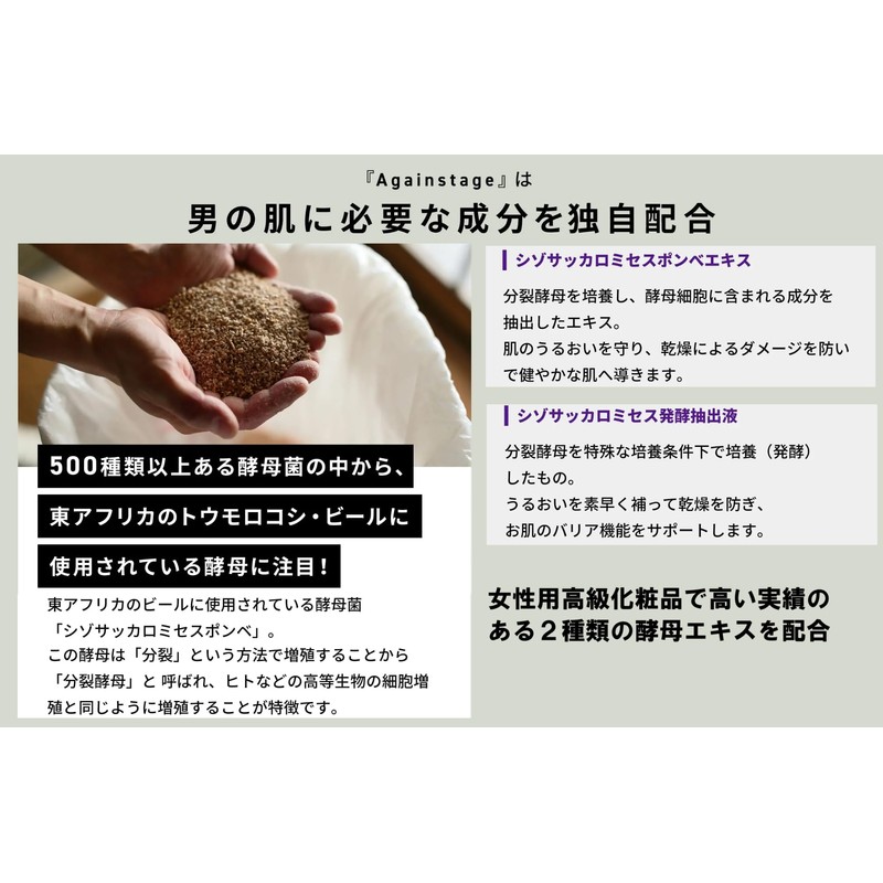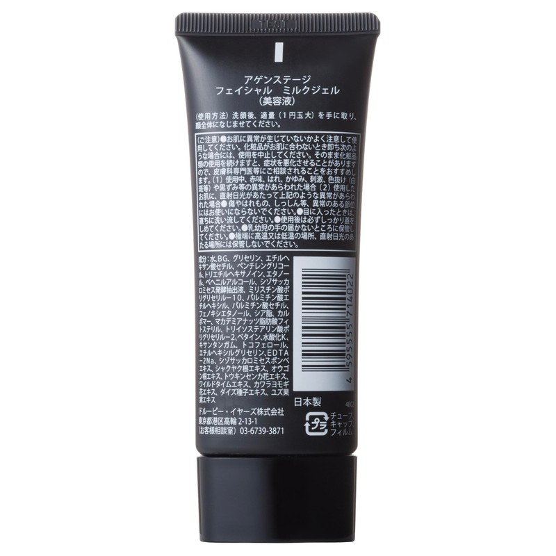 - About Agen Stage: Easy 2-step aging care developed for the skin that began to feel the age of men in their 30s to 40s. *Cosmetics. 2 types of yeast extract proven in high-quality aging care cosmetics (moisturizing ingredient: shizocaromyse fermentation extract), and 7 types of plant extracts, which focuses on various skin problems for men (moisturizing ingredient: peony root extract, oval root extract, coil root extract, lunka flower extract, wild time extract, kawara flower extract. Daizu Seed Ecu and yuzu fruit extract