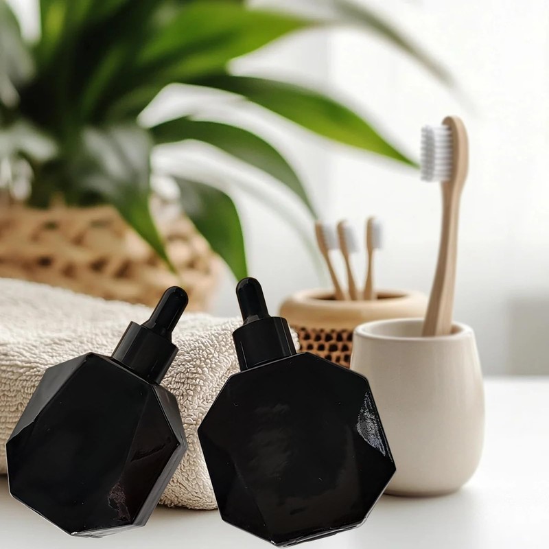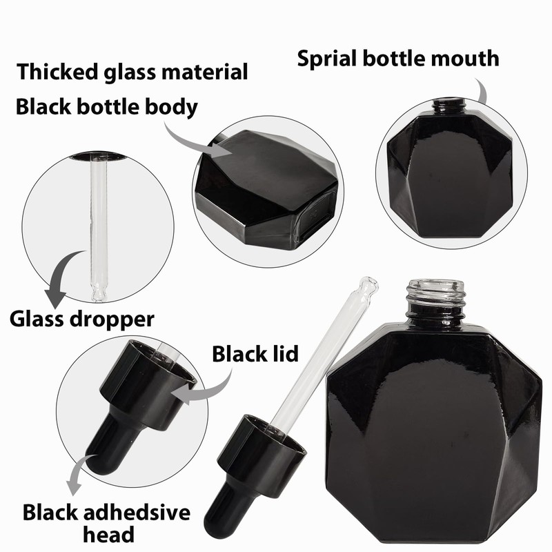 - 50ml/1.7 oz Black dropper bottles is made of thickened glass, with functional design and quality material with glass dropper and funnel to help fill the liquid efficiently.