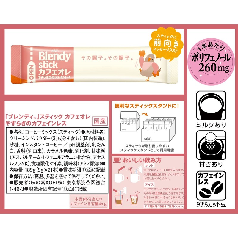 AGF Blendy Stick Cafe au Lait Yasuragi Caffeinated 21 Bottles (Caffeinated Coffee)