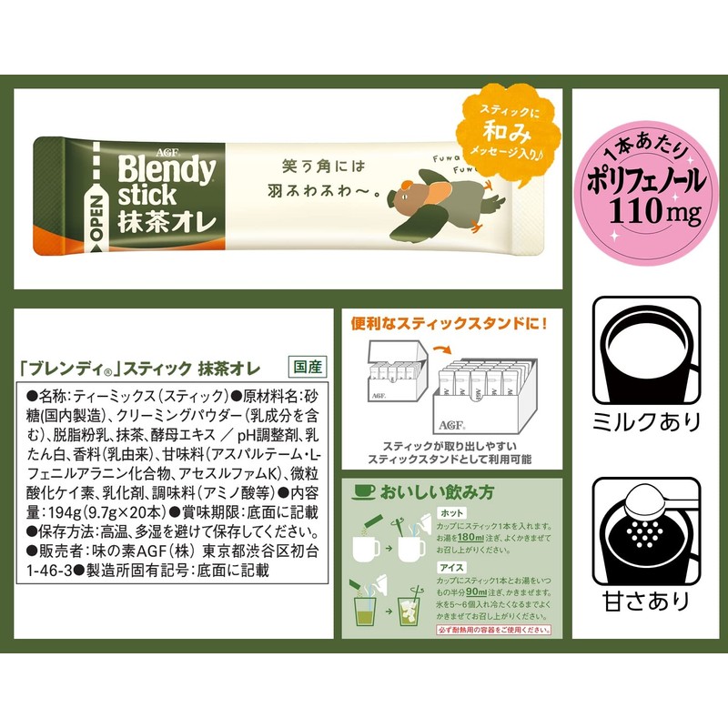 - Ingredients: Sugar (made in Japan), creaming powder (including milk ingredients), skim milk powder, matcha tea, yeast extract, pH adjuster, milk protein, fragrance (derived from milk), sweetener (aspartame, L-phenylalanine compound, acesulfame K), fine silicon oxide, emulsifier, seasoning (amino acids, etc.)