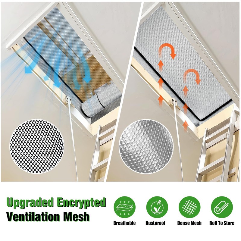 - UPGRADE DESIGN:A layer of encrypted screen mesh was added to the top of the attic cover, which can better ventilate in summer. When not in use, the mesh can be rolled up and fixed with hook and loop tape.