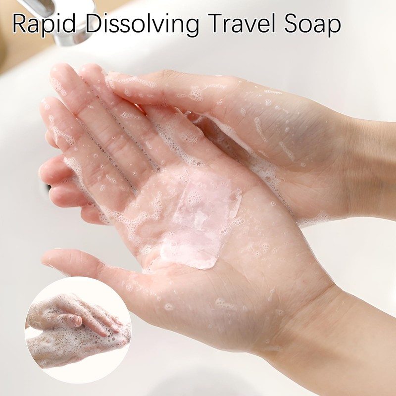 • Rapid Dissolving Travel Soap: Our paper travel soap is designed for convenient hand and face washing during travel. It dissolves quickly when it comes into contact with water, providing a refreshing cleanse in no time.