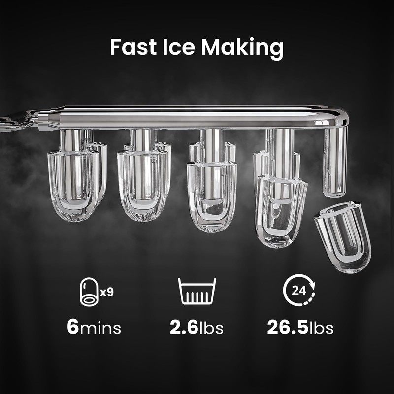 • Rapid Ice ProductionExperience the convenience of quick ice-making with AGLUCKY ice maker, which takes just 6-8 minutes each round to form 9 shaped bullet-shaped ice cubes, producing 26.5 pounds of ice a day. With a 1.2L water tank, you won't have to constantly refill the ice machine with water,ensuring you never run out of ice during gatherings or hot days.