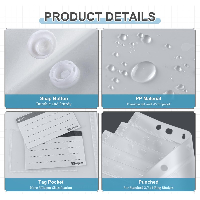 - [Ring Binder File Folder]: Reinforced multi-punched spine is designed on the A4 punched pockets, fit most standard 2/3/4 lever arch and ring binder files.The ideal A4 snap botton pocket for storing and organising a large number of documents and paired use makes files more organized.